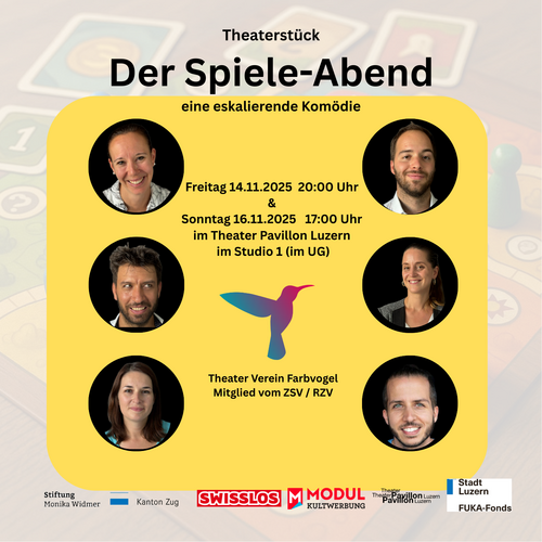 -  14.11.2025 Theaterstück "Der Spiele-Abend" im Theater Pavillon Luzern Theaterstück "Der Spiele-Abend" Theaterstück "Der Spiele-Abend"Rechte: Breuninger Theater Verlag Aufgeführt durch den Verein Farbvogel