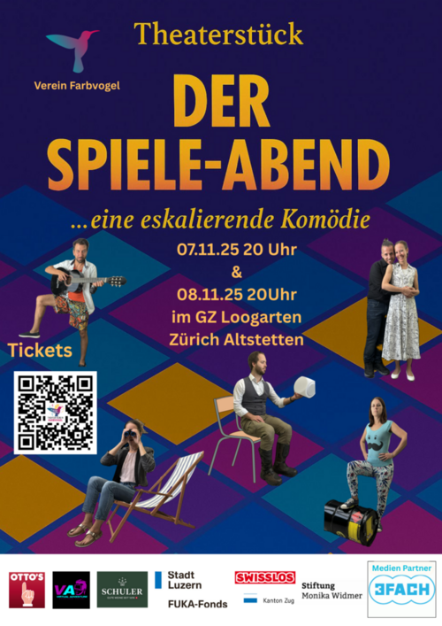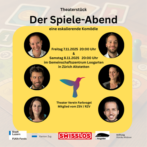 -  8.11.2025 Theaterstück "Der Spiele-Abend" in Zürich GZ Loogarten Theaterstück "Der Spiele-Abend" Rechte: Breuninger Theater Verlag Aufgeführt durch den Verein Farbvogel