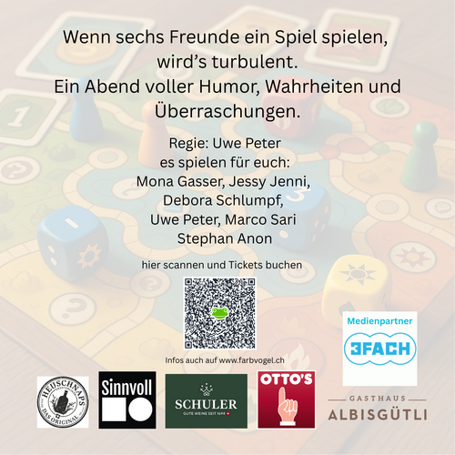 Co-Regie: Elly Suter & Luana RothEs spielen: Debora Schlumpf, Jessy Jenni, Mona Gasser, Marco Sari, Stephan Anon, Uwe Peter Abendkasse & Bar Betrieb sowie Saal Öffnung ab 19:00 Uhr, Bezahlung vor Ort nur Bar oder mit TWINT möglich. Stückdauer 2h inkl. 20 min Pause Anreise mit dem ÖV wird empfohlen. Es gibt nur wenige Parkplätze in der blauen Zone um das Gemeinschaftszentrum Loogarten herum. Mit „Der Spiele-Abend“ widmet sich das Ensemble einem Thema, das uns alle betrifft: Freundschaft. Das Stück stellt schonungslose Fragen: Wie ehrlich bin ich mit meinen Freunden? Kann man über tiefgründige Themen sprechen, ohne aneinanderzugeraten? Halten Freundschaften jede Wahrheit aus – oder braucht es auch Oberflächlichkeit? Die Inszenierung beleuchtet die feinen Linien zwischen Nähe und Distanz, Vertrauen und Geheimnissen. Wie gut kennen wir unsere Freunde wirklich? Das Publikum erwartet eine moderne, musikalische und realitätsnahe Umsetzung – authentisch, ohne Klischees und ohne direkte Einbindung des Publikums. Ziel ist es, dass sich die Zuschauer in den Figuren wiederfinden, mitfühlen und vielleicht sogar ihre eigenen Freundschaften hinterfragen. Wir freuen uns auf eine spannende, emotionale und erkenntnisreiche Theatererfahrung! Tickets gibt es hier oder wenn ihr auf den Flyer klickt.